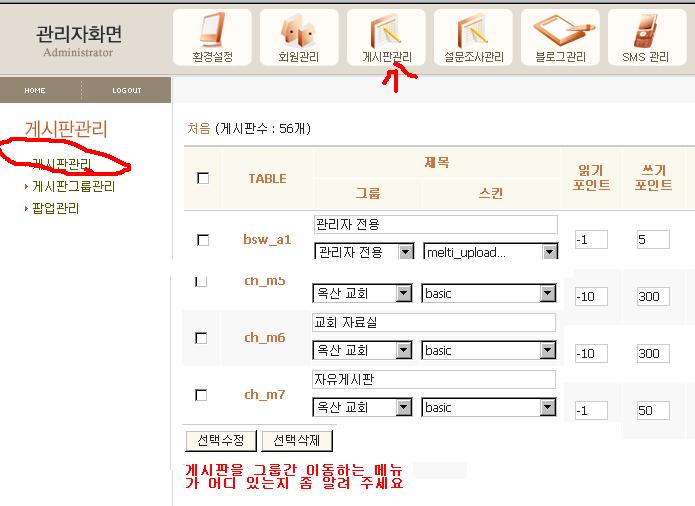아무리 찾아봐도 구룹안에 게시판 자체를 다른 그룹으로 이동하는 메뉴가 안보여요.. 아궁@@