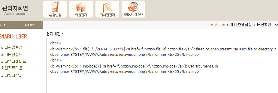 관리자화면에서 제나버전정보를 보면 이상합니다.