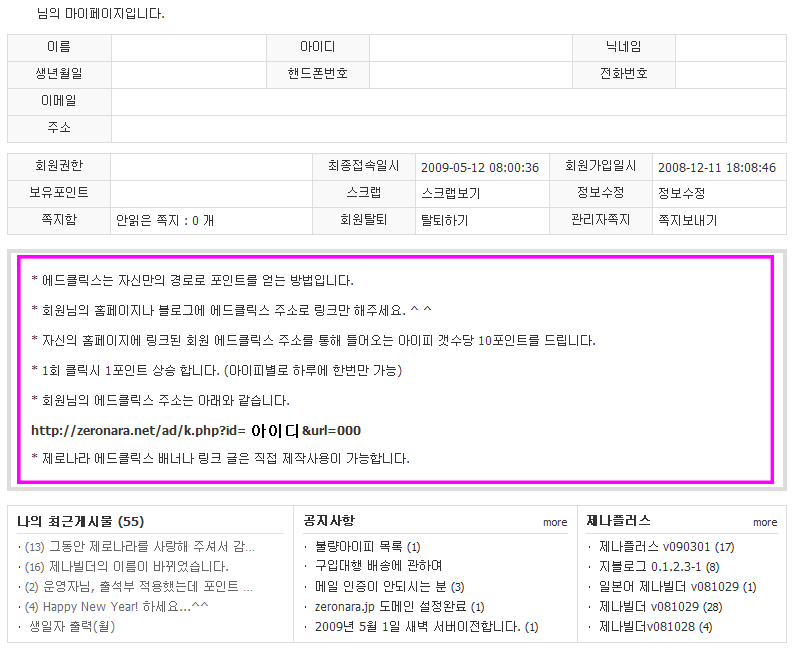 * 자신의 홈페이지에 링크된 회원 에드클릭스 주소를 통해 들어오는 아이피 갯수당 10포인트를 드립니다.<br>