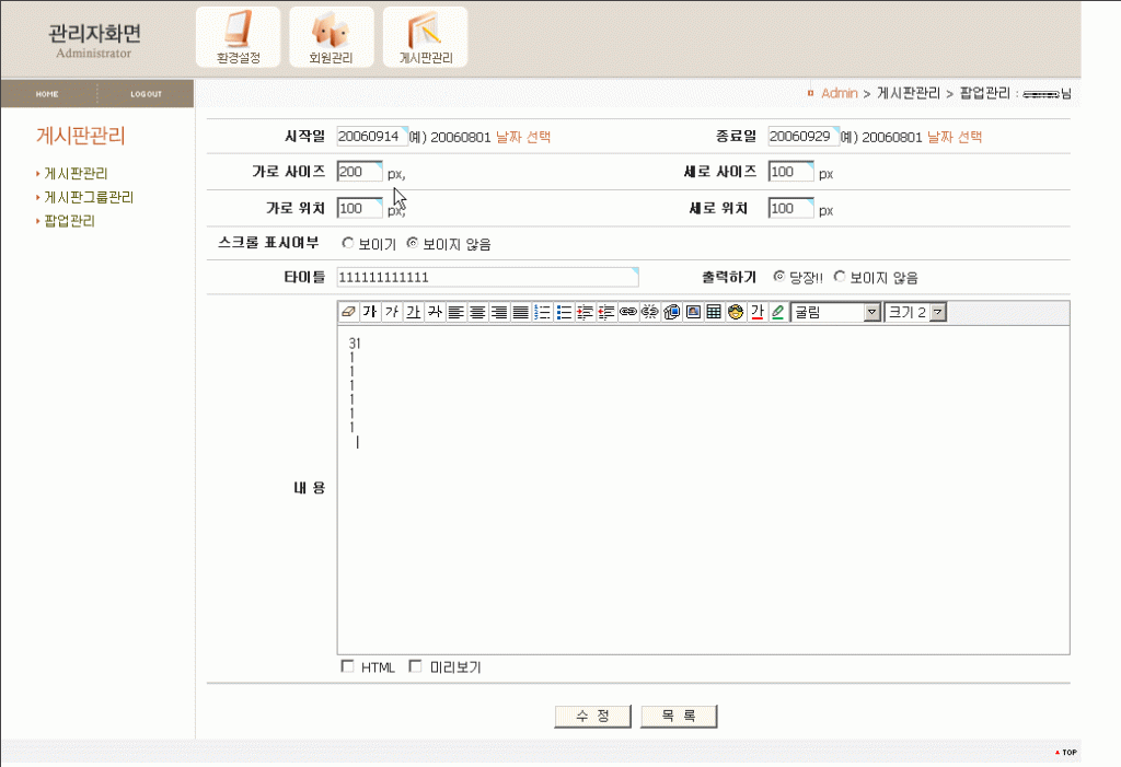 버전업 : 1.5 날짜 : 2006.09.21 스크롤 표시여부 오류 수정 버전업 : 1.4 날짜 : 2006.09.05 팝업뜨는 순서 바꿈. 버전업 : 1.3 날짜 : 2006.08.17 버전업 : 1.2 날짜 : 2006.08.14 수정한 사람 : 부비컴 ===================================== 폿옹님의 팝업관리자로부터 http://www.sir.co.kr/bbs/board.php?bo_table=g4_tiptech&wr_id=4979&sca=&sfl=wr_subject%7C%7Cwr_content&stx=%C6%CB%BE%F7&sop=and bikomi@gmail.com ===================================== 몇몇기능 개선 및 수정을 하였습니다. [버전 1.5에서의 개선점] 1. 스크롤 표시여부 저장 및 수정하는 부분에 있던 오류를 고침 popup_form.php, popup_source.php 파일 두개가 수정되었습니다. [버전 1.4에서의 개선점] 위치조절을 하지 않은 경우 팝업창이 최신것부터 떠서, 최신팝업창이 맨 아래에 깔리는 문제발생(홍다니님이 제시) 그래서, 순서를 거꾸로 바꿈 - 최근 팝업창이 맨위에 뜨게됨. 바뀐파일 popup_source.php,README.txt 따라서 popup_source.php만 다시 적어주셔도 됩니다. [버전 1.3에서의 개선점] 1. 팝업창에서 디버깅용 코드 보여지던 부분 수정 2. 위치조절에서 상하 위치가 적용 안되던 것 수정 [버전 1.2에서의 개선점] 1. 스크롤 표시여부 추가 (팝업의 내용이 세로로 긴경우를 감안하여..........) 2. 다중 팝업창이 가능하도록 수정(한번에 여러개의 팝업창이 뜰 수 있도록 함.) 2.1 팝업창이 뜨는 위치를 조절 할 수 있도록 함. 3. 관리자페이지에서 팝업등록시 날짜 입력할 때, firefox에서 팝업이 안뜨는 문제 해결. (살짝 피해감) 4. 기존 이용자의 경우 업그레이드 안되는 문제 해결(DB 테이블이 존재하는 경우 drop하고 다시 등록 함) [용도] 그누보드의 라이브러리를 이용해 일반적인 팝업관리 프로그램을 만들어 봤습니다. 큰 특징은 없고 스크린샷 처럼 그누보드 관리자 환경에서 관리를 하게됩니다. [사용전 주의] 그누보드 adm 폴더의 admin.menu300.php 와 upgrade.php를 덮어 쓰게 되니 덮어 씌우기전에 백업을 하세요.(메뉴가 늘어나는 것이니, 별로 영향은 없습니다만..) 그누보드관리자 - 환경설정 - 업그레이드를 하는 경우, 기존 이용자의 경우, 등록된 팝업기록이 모두 삭제 됩니다.!!! 제가 실력이 없기도 하고, 기타등등의 이유로... 이렇게 처리했습니다. 졸속이지요. ^_^ 버전 1.2 이상(1.2, 1.3, 1.4등등)을 이용하는 분들은 업그레이드 할 필요가 없습니다. [설치방법] 1. gnuboard4 안의 파일들을 그누보드 안에 넣어주세요. [사용전 주의] 참조 2. 그누보드 관리자 - 환경설정 - 업그레이드 해주세요 (DB에 팝업창 만드는 것입니다.) 그 후 파일을 지워주세요. \gnuboard4\adm\upgrade.php (안지우면 실수로 등록된 팝업이 모두 사라질수 있습니다.) 3. 그누보드 관리자 - 게시판관리 - 팝업관리 에서 팝업 내용등을 입력하세요 4. popup_source.php 를 열어서 나오는 소스를 현재 사용중인 index.php 파일내 맨 아래에 넣어주세요 </body>위면 적당할 듯 합니다. 예) >>여기위치에 .. 파일 내용 전부 그대로~~~~<< <? include_once("$g4[path]/tail.php"); ?> 5. 그후 그누보드 관리자 - 게시판관리 - 팝업관리 에서 내용추가하면서 사용하시면 됩니다. |