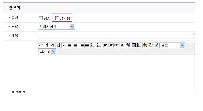 <input type=checkbox value="adult" name="adult" <?=$adult_checked?>>성인용 </td></tr>