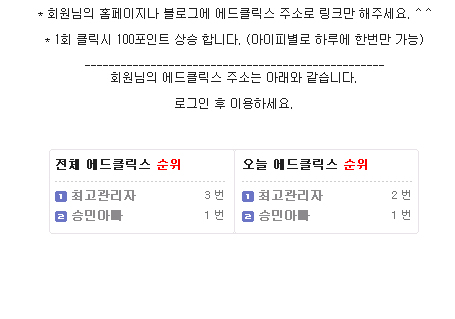 * 자신의 홈페이지에 링크된 회원 에드클릭스 주소를 통해 들어오는 아이피 갯수당 10포인트를 드립니다.