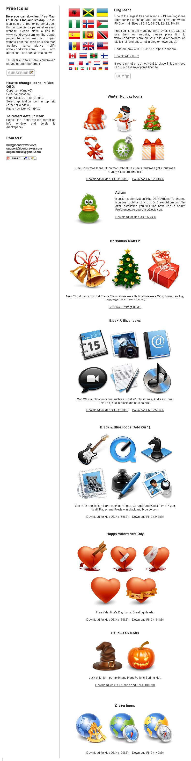 Here you can download free Mac OS X icons for your desktop. These icon sets are free for personal use. For commercial or personal use on website, please place a link to www.icondrawer.com on the same pages the icons are used. If you want to post the icons on a site that archives icons, please notify www.icondrawer.com. For any questions - see contact info below.